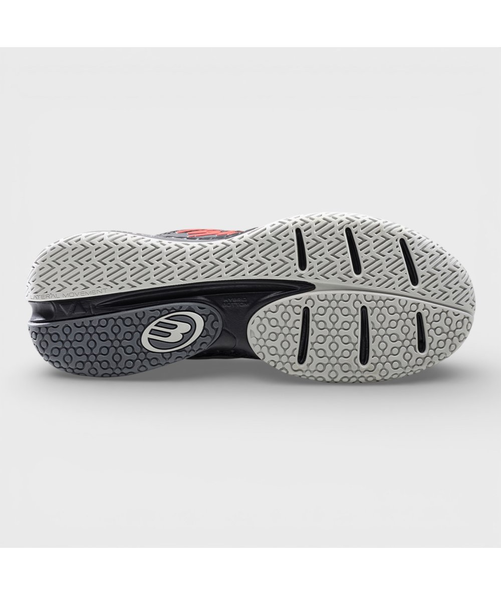 Избегая сшивания отдельных частей (эффект перчатки) удалось сделать обувь несколько легче и гибче. Подошва разработана специально для игры в падел и имеет двойной протектор. С одной стороны, протектор представлен виде елочки, что позволяет достичь идеального сцепления с покрытием, не давая обуви проскальзывать. Другая, напротив, пупырчатая – обеспечивает устойчивость и необходимое сцепление при резких боковых движениях и возвращениях в исходное положение. Для большей амортизации и для более естественного сгибания стопы в переднюю часть подошвы была интегрирована технология - FlexRift (небольшие углубления для лучшей амортизации). Спереди обувь имеет более высокие борта (Sole Shield) и резиновую насечку (Toughtoe), что помогает дополнительно защитить обувь при внешних контактах и повысить ее износостойкость. Также есть стелька из резинового материала EVA с текстильным армированием, объединенная с подошвой для большого комфорта и амортизации (Stitch Insole). В задней части стопы подошва разделена специальной выемкой посередине, что дает отличную амортизацию и поддерживает стопу во время боковых движений (технология Lateral Movement). Пяточная часть дополнительно укреплена для поддержки голеностопного сустава. Это существенно снижает риск получения травм и повышает устойчивость при быстрой смене движений.