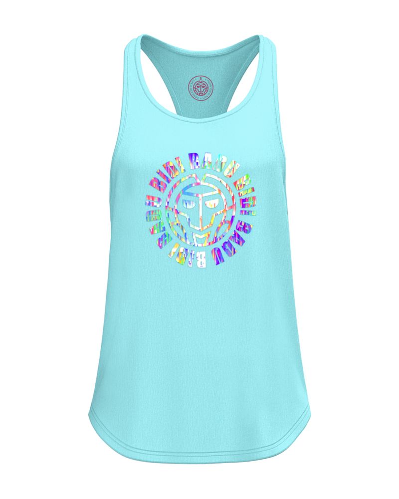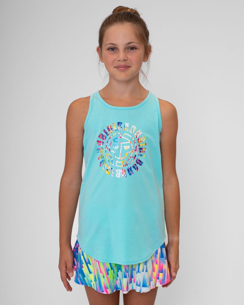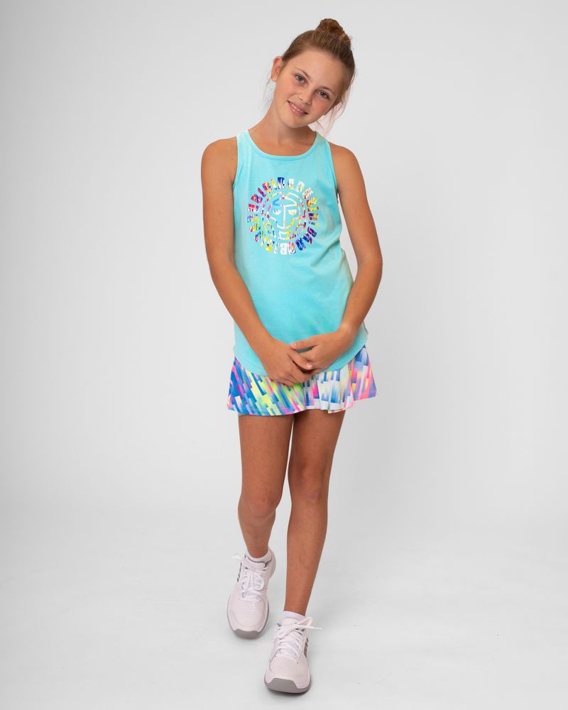 Яркий голубой цвет в сочетании с разноцветным привлекательным принтом будет выделять вашего ребенка на теннисном корте.