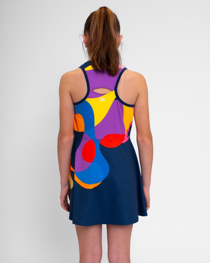 Детское платье пошито из переработанного полиэстерового материала, что позволяет отлично впитывать влагу в самую жаркую погоду. Спереди платье имеет круглый вырез и свободные открытые плечи сзади, что гарантирует абсолютную свободу при движениях.