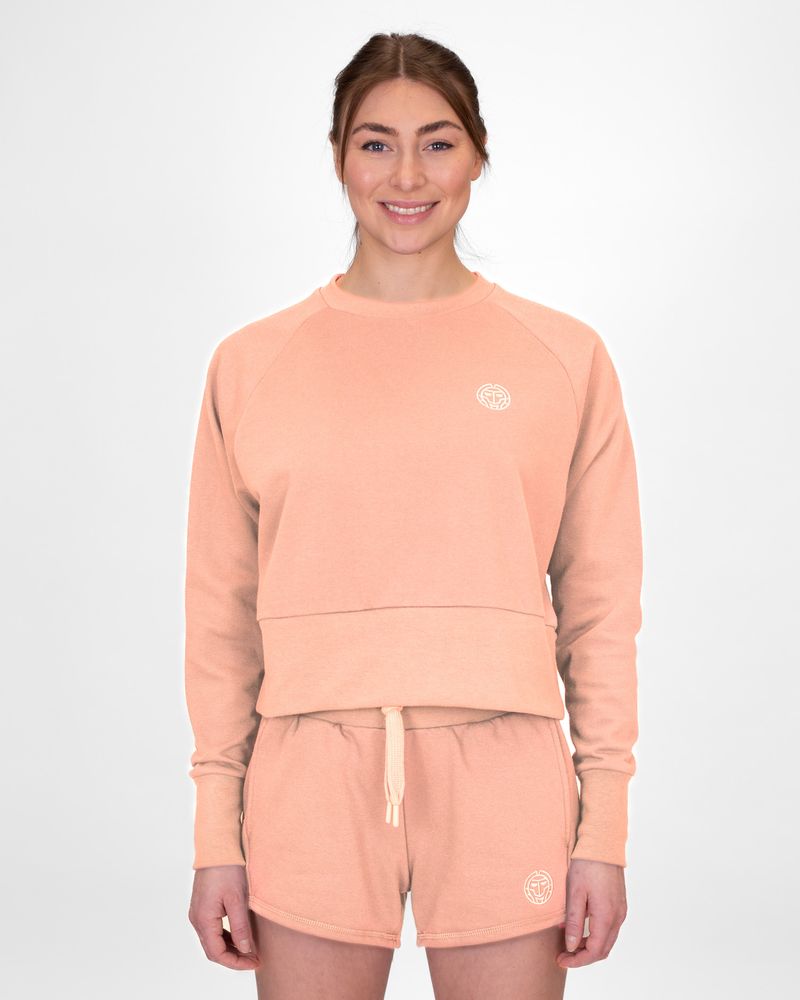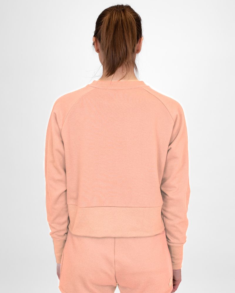 Cвитшот в ярком персиковом цвете пошит из мягкого высококачественного хлопка и переработанного полиэстера. Такое сочетание поможет согреть вас в прохладную погоду и при этом подарит вам прекрасную свободу движений. Высокий круглый вырез и минималистичный свободный дизайн делают этот свитер невероятно универсальным. Вы можете сочетать его как с джинсами, так и спортивными штанами.