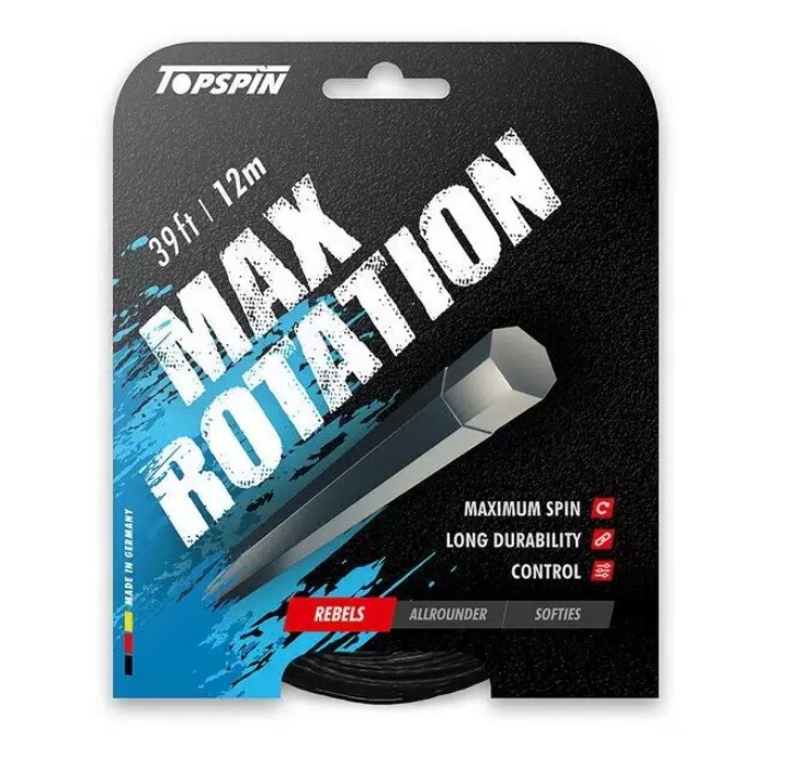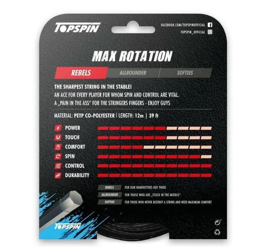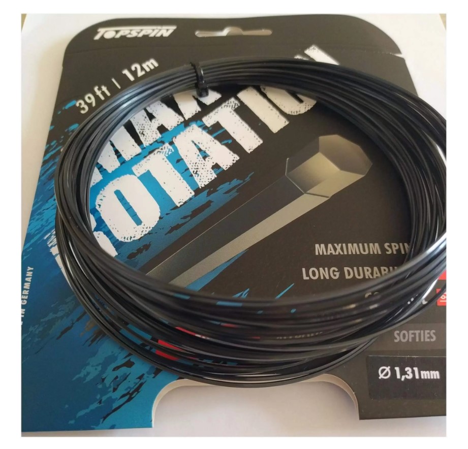 Теннисные струны Topspin Max Rotation из жесткого полиэстерового материала дают отличное сочетание долговечности, превосходного контроля и максимального вращения. Семиугольная структура в комбинации с текстурированными насечками позволяет струнам быстро возвращаться в исходное положение, что дает абсолютное вращение.