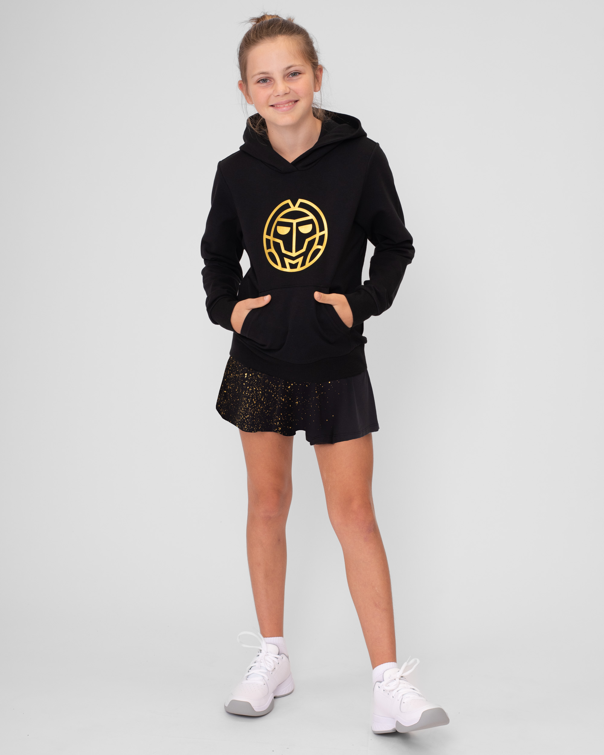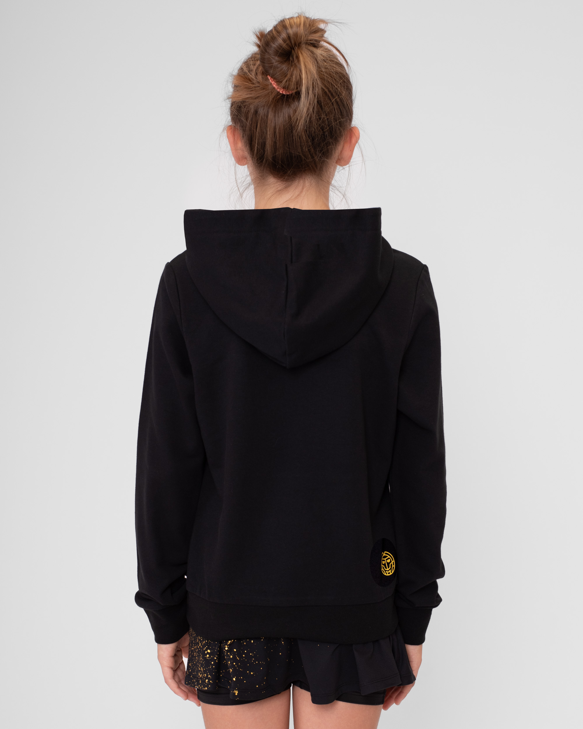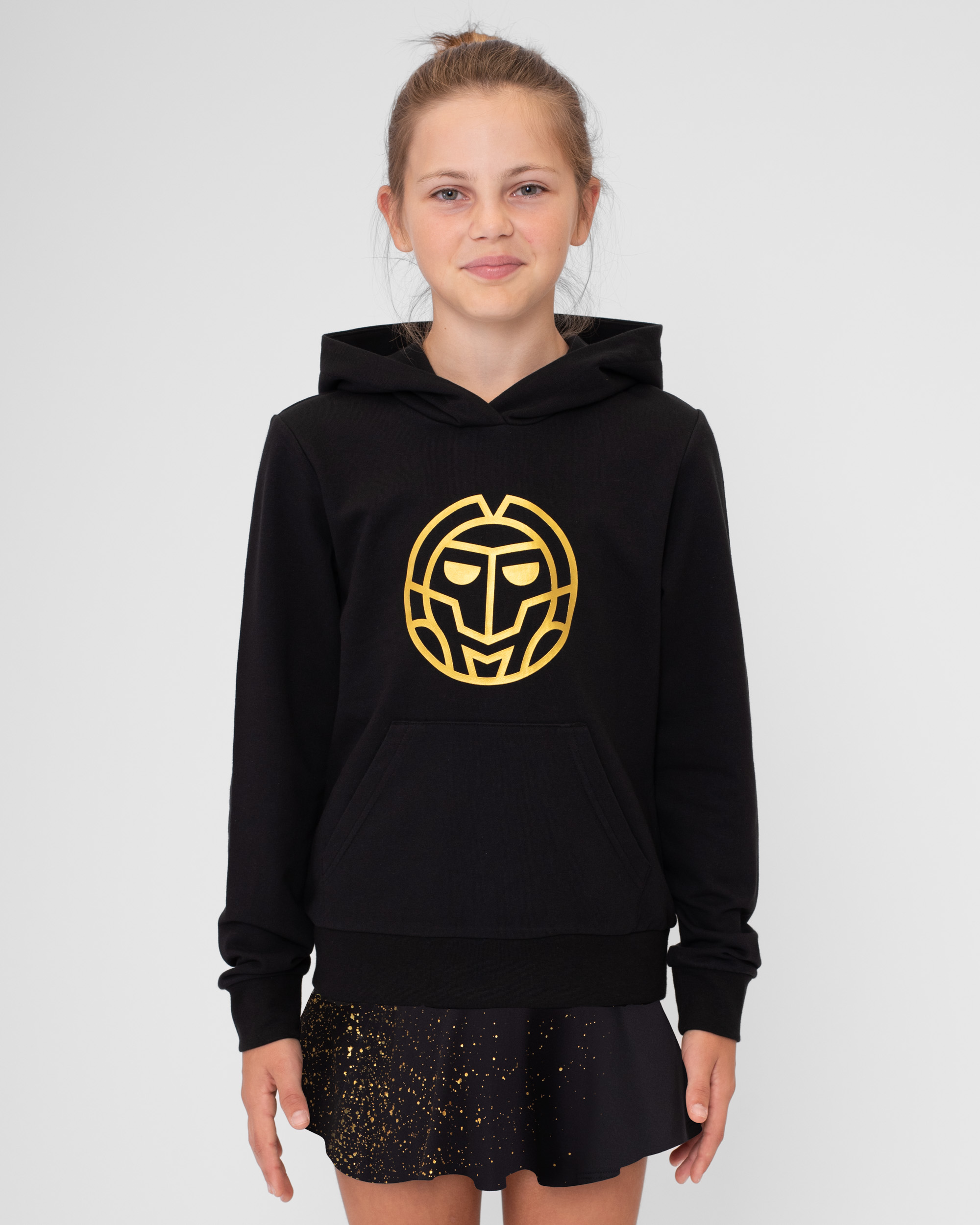 Детская толстовка в сочетании черного и желтого цветов из новой коллекции Paris 2024! Толстовка пошита из полиэстерового материала с добавлением хлопка, что позволяет не только отлично отводить влагу, но и сохранять тепло. Капюшон регулируется с помощью двух голубых шнурков, а в боковых карманах можно разместить теннисные мячи или просто согреть руки.