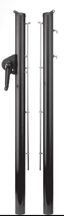 Круглый столб (cечение 73 мм.) изготовлен из алюминия с черным пластиковым покрытием. Специальный профиль с тремя отсеками, очень прочный. Стержень для крепления сетки, винты и крючки изготовлены из нержавеющей стали.